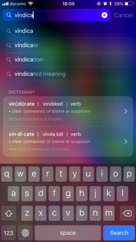 Spotlight検索(ホーム画面でswipe downして起動)で英単語を入力すると、suggestionにOxford Dictionaryが出てくると思うんですが、 これ、例文、派生語はもちろん語源まで載ってるし、 オフラインでも使えて早いので、かなり使える子です。 (ということに…